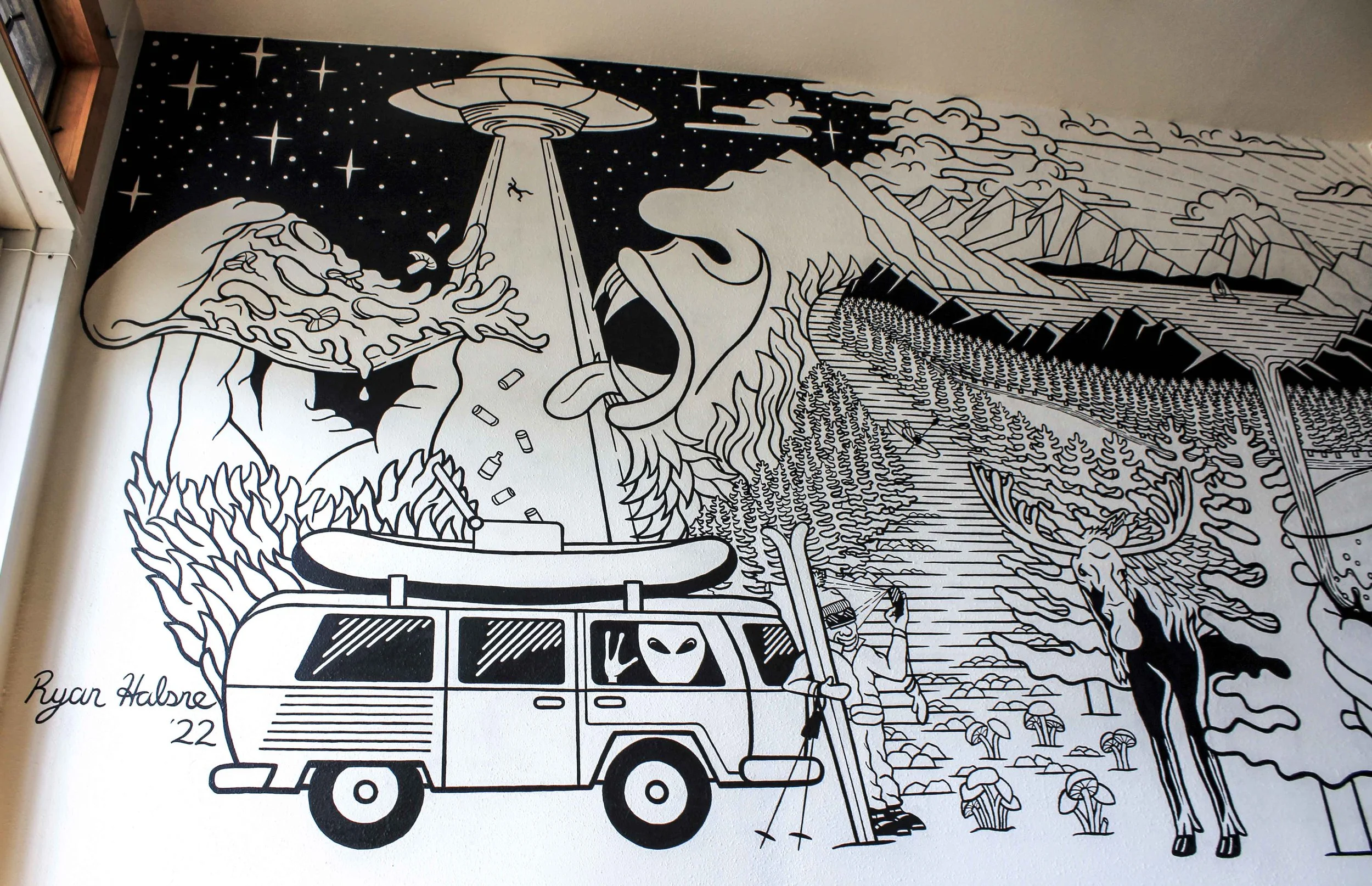 When the fellas down at Cove & Craft asked me about painting a mural in their new taproom location, they trusted me to paint whatever I wanted. Excited by this prospect, I went home and sketched out my final proposal in one sitting. Knowing I should still include Summit County culture, as well as the pizza and beer that they serve, I wanted to build the scene off a few silly characters. The large yeti emerging out of the mountains indulging in cheesy pizza and beer is balanced by Smokey Bear reminding us to “drink local”. Then there are aliens.
