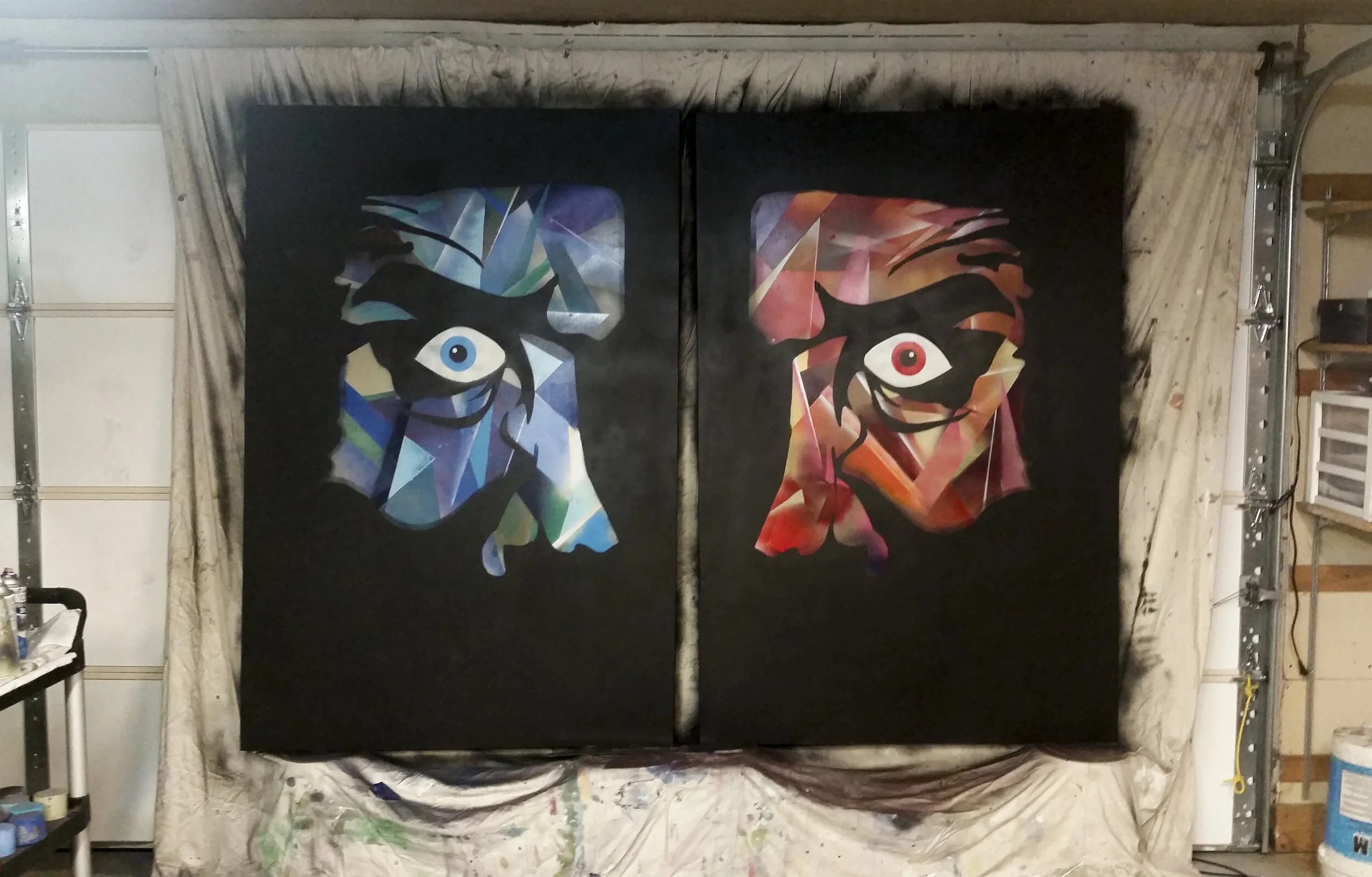 This is the painting that spawned the idea of Tronos Paint. Founding collaborators, Ryan Halsne and Mitch Klee decided to get handy with spray paint in the neighborhood woods. Originally, the plywood wall was intended as a snowboarding structure. It was decided the blank wood needed a makeover one summer. It was not their first time using spray paint, or even making stencils, but definitely a first at that 10 foot high scale. Feeling accomplished, the two young artists were inspired to keep spray painting.